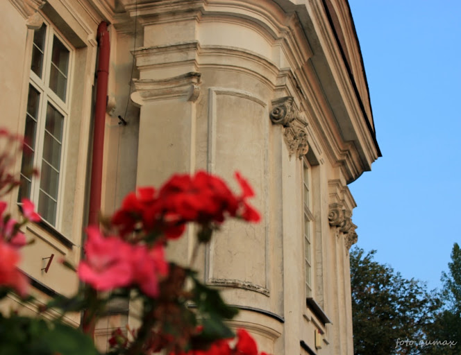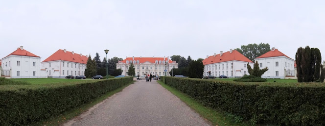 Dawniej budynek główny był połączony z bocznymi oficynami półkolistymi galeriami kolumnowymi.